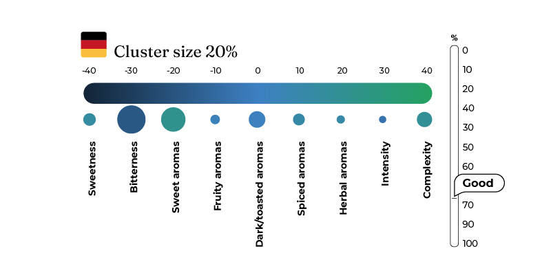 Il cluster tedesco più ampio, che copre il 20% del mercato, è caratterizzato da una preferenza per prodotti a media intensità, caratterizzati da una spiccata dolcezza e una forte preferenza per aromi dolci tra cui quelli di vaniglia, miele e caramello. Questo cluster rappresenta una parte significativa dei consumatori tedeschi e suggerisce una forte domanda per prodotti con queste specifiche caratteristiche.